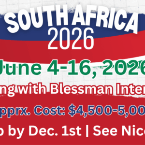 Anyone 16 or older don’t miss this life changing opportunity to minister in South Africa June 4-16, 2026. We will have the opportunity to help with a feeding program, an eye glass clinic, shoe giveaway and so much more. Cost: $4,500-5,000 Passport required. Minors must have an accompanying guardian with them. See Nicole Joy for more details or to sign ...